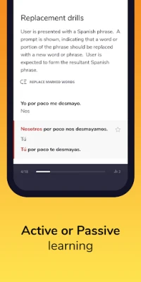 Passive: Fully designed to support the ability for you to listen to the immersive Spanish lessons while your eyes are focused on something else (working, exercising, driving, etc.)