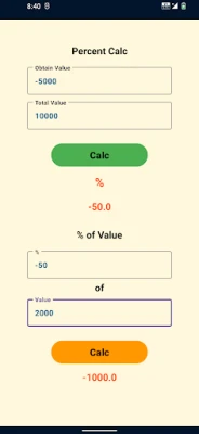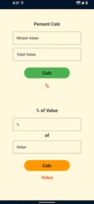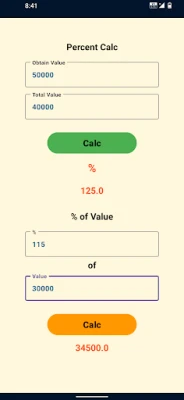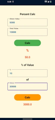 This app is design to calculate percent, firstly enter obtain value, total value than click calc button to calulate percent, secondly enter percent, total value than press calc button to get obtain value according to percent.