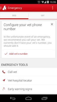 • Programmable veterinary contact number to be available when needed throughout the app.